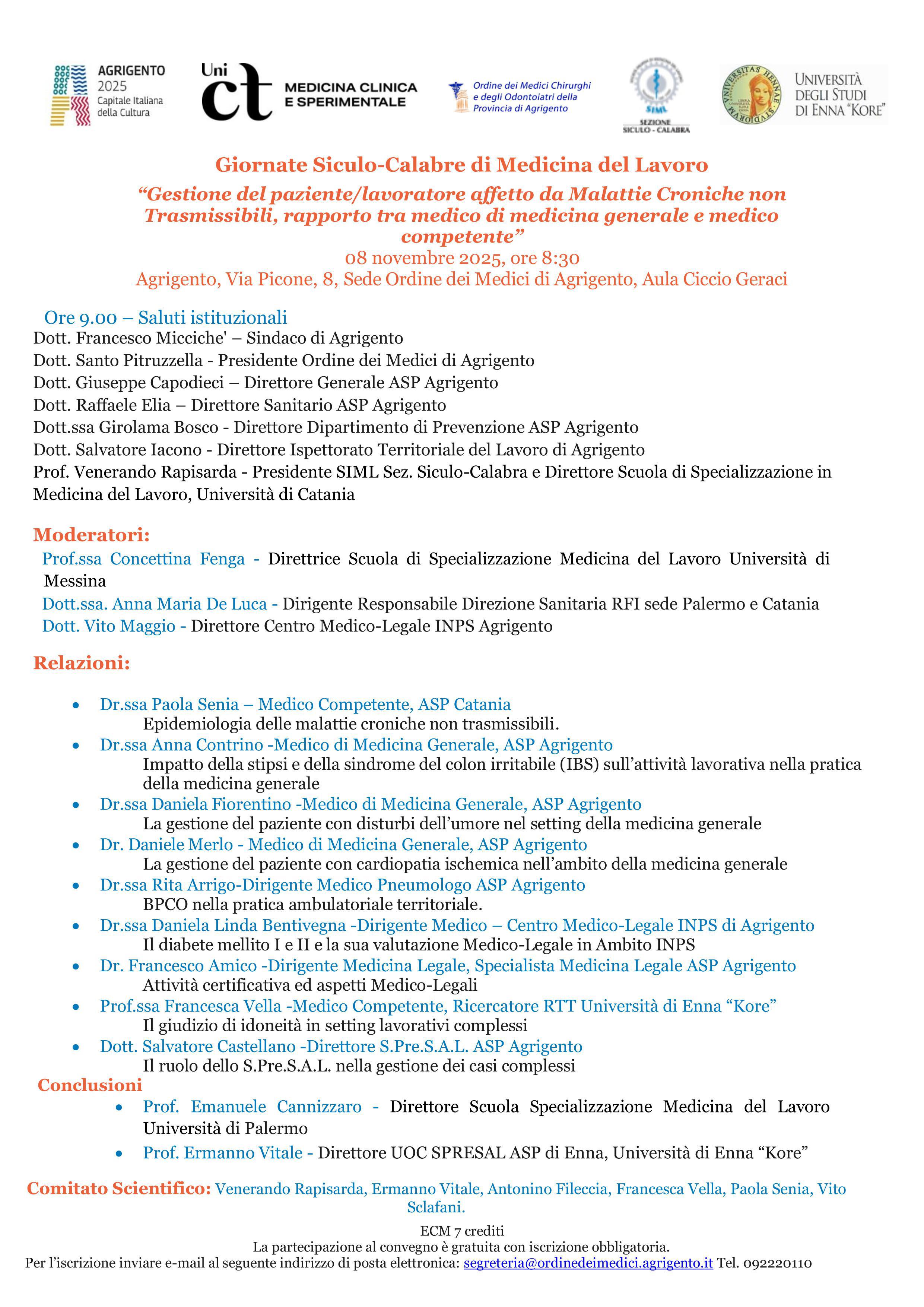 Giornate Siculo-Calabre di Medicina del Lavoro “Gestione del paziente/lavoratore affetto da Malattie Croniche non Trasmissibili, rapporto tra medico di medicina generale e medico competente” (inizio ore 8.30)